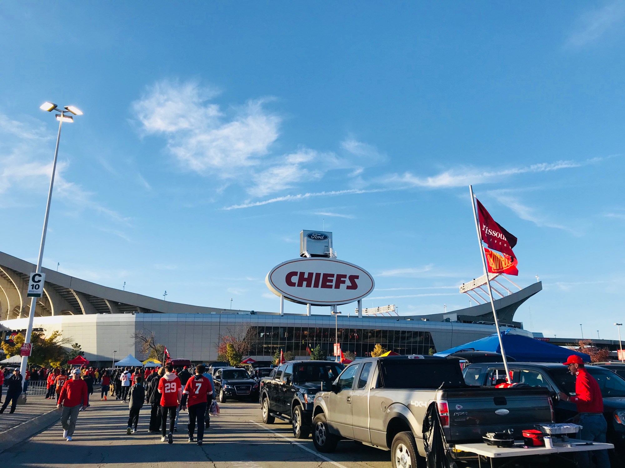 Am Sonntag wurde unsere Woche gekrönt vom Football Match Kansas City Chiefs vs Cincinnati Bengals. Der Hammer! Aber auch ein bisschen Assi-Publikum… Der Knaller ist aber, dass die ein richtiges Event daraus machen: Picknick, Barbecue, Mucke!